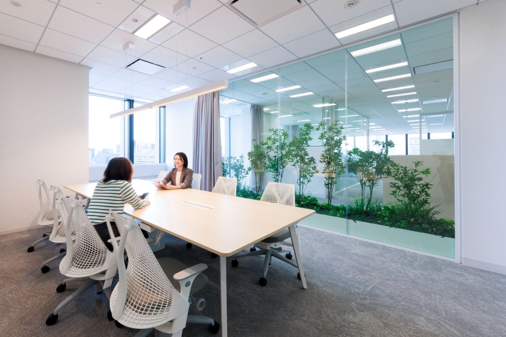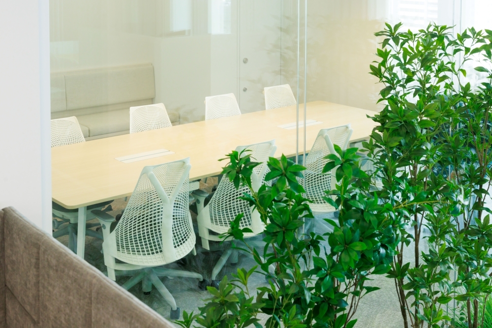 全体のカラーは白とライトグレーを基調としたモノトーンでまとめ、ガラスや石目などの無機的なマテリアルを採用。中でも、間仕切りのすべてにガラスを用いるという強いこだわりにより、視線や光が遮られず、オフィス全体に明るさと開放感が行き渡る空間としています。集中して仕事に取り組めるすっきりとした落ち着きのある雰囲気の中に、グリーンを適度に取り入れることで、緊張感をやわらかく和らげています。