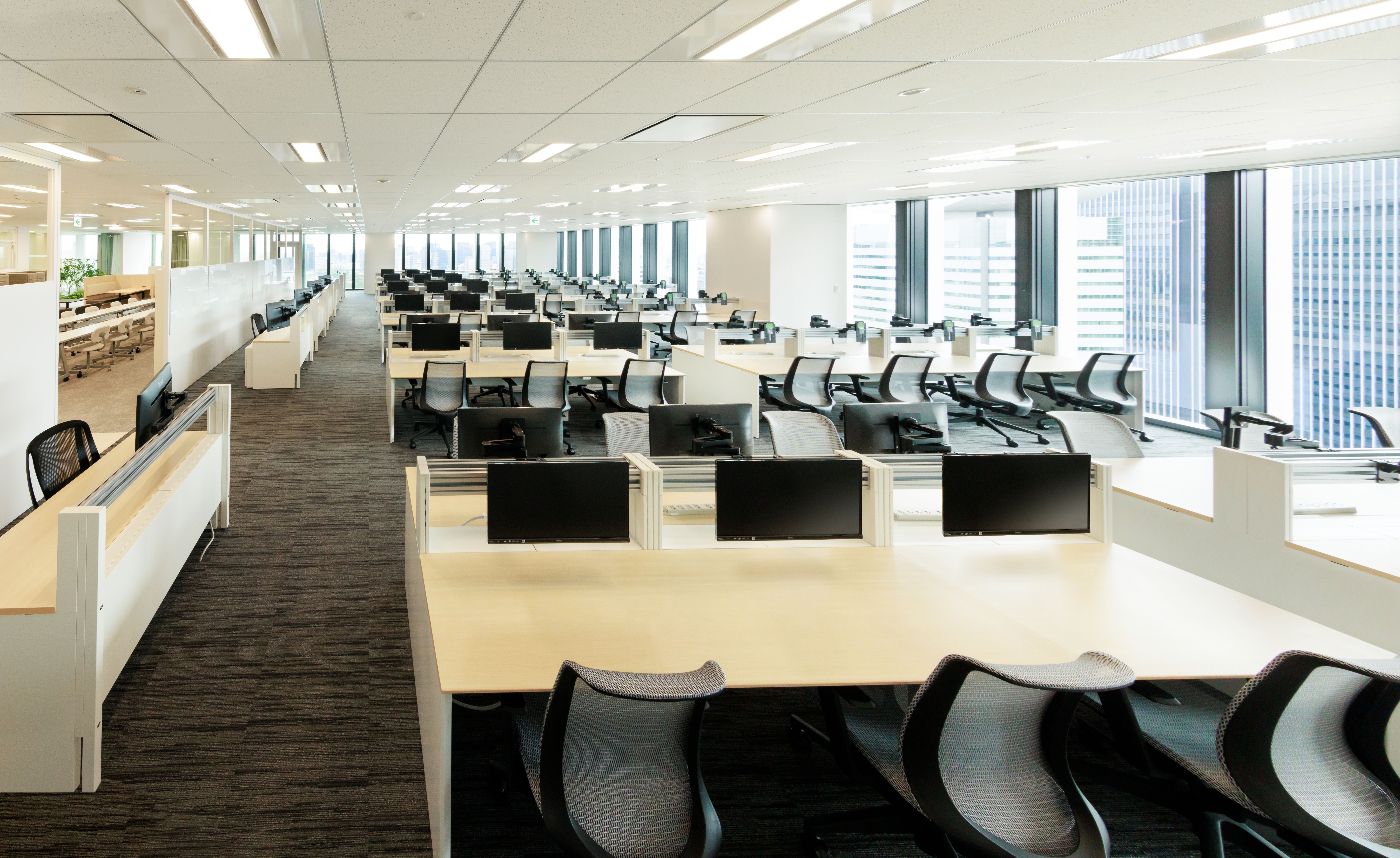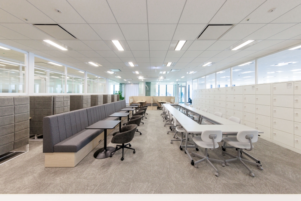 レイアウトは、来客エリアと執務エリアを大きく区画し、用途ごとに明確な切り替えができる計画としています。執務エリアは、眺望の良い窓方向にデスクを配置し、視線が抜けることで快適に作業できる環境を整備。一方、ラウンジエリアはベンチソファなどのカジュアルな家具で構成し、執務エリアとは異なる雰囲気の中で、気分転換しながら作業できる席や、コミュニケーションを取りやすい対面席をバランスよく配置しました。