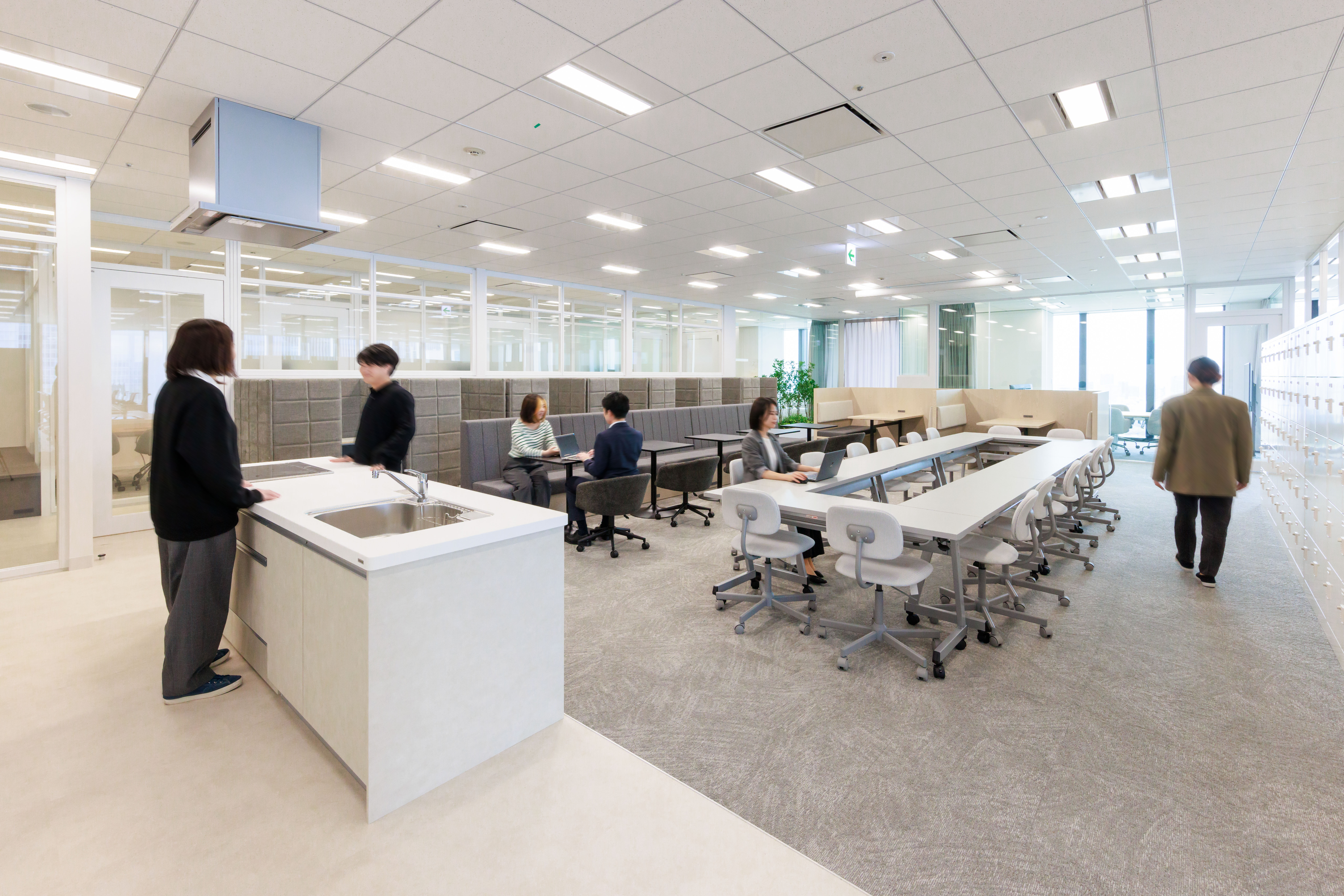 キッチンはメイン動線上に設けることで、日常の中で自然な会話や交流が生まれる場として計画しています。ダクト工事が不要なレンジフードや、給排水工事を行わずに設置できる電動式給排水ユニットを採用することで、オフィス空間では実現が難しいキッチン設置を可能にしました。